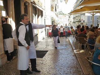 Fado is advertised in the old part, down from the church where the old woman pats her breast and talks to herself lost in some other time. Maybe later we will have some paella there and listen to the traditional music.